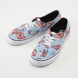 ハイビスカスとマスター・ヨーダがプリントされています。スカイブルーに鮮やかなハイビスカスが映える、一見すると普通にキレイな花柄のオーセンティックですがよく見るとハイビスカスの上に小さなヨーダが乗っています。理力と共にあるVANSです。