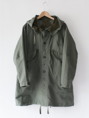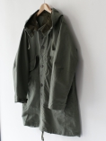 ミリタリーテイストのフードコート。厚手のコットン生地に折りたたみ可能なフィッシュテールが特徴です。