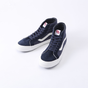 OGシリーズのスエード×キャンバスのSk8-Hi。通常のSK8よりすっきりしたデザインの人気型番。ヒールパッチやサイドラバーのゴムの巻きなども当時のVANSを再現しています。また、OGシリーズの中では珍しくボディとシューレースが同色で揃えられ、ゴムのサイドのラインのないのが特徴です。