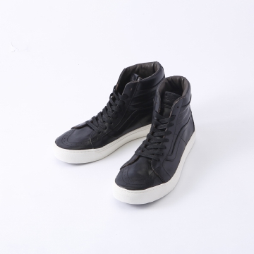 VANS Vault × HorweenのSk8-Hi。ホーウィンレザーらしい上質だけど独特の色むらのあるオイリーなレザーが特徴です。若干コーティングされたシューレースとホーウィンレザーの相性もグット。足首-かかとの内側部分のあてに貼られたレザーも上質で足入れの良い一足に仕上がっています。また、モデルスタイル名もSk8 – Hi Cup LXと付けられスタンダードなSk8よりOGなどのリイシュー型番に近いデザインです。ハイカットのトップ部分はステッチではなくレザーの縫い合わせに、ソールのサイドステッチやアウトソールの溝なども他のシリーズには無いの独特な仕様です。