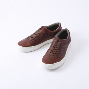 VANS Vault × HorweenのOld skool。ホーウィンレザーらしい上質だけど独特の色むらのあるオイリーなレザーが特徴です。若干コーティングされたシューレースとホーウィンレザーの相性もグット。かかとの内側部分のあてに貼られたレザーも上質で足入れの良い一足に仕上がっています。また、モデルスタイル名もOld skool Cup LXと付けられスタンダードなOld Skoolに比べてノーズの短いクラシックな印象。ソールのサイドステッチやアウトソールの溝なども他のシリーズには無い独特な仕様です。