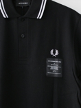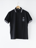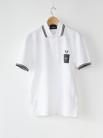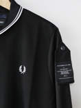 バックプリントにFRED PERRYの大定番ポロシャツM12のプリントがユニークなPrinted Twin Tipped Shirt。月桂樹の刺繍の下にACFのパッチが入っています。